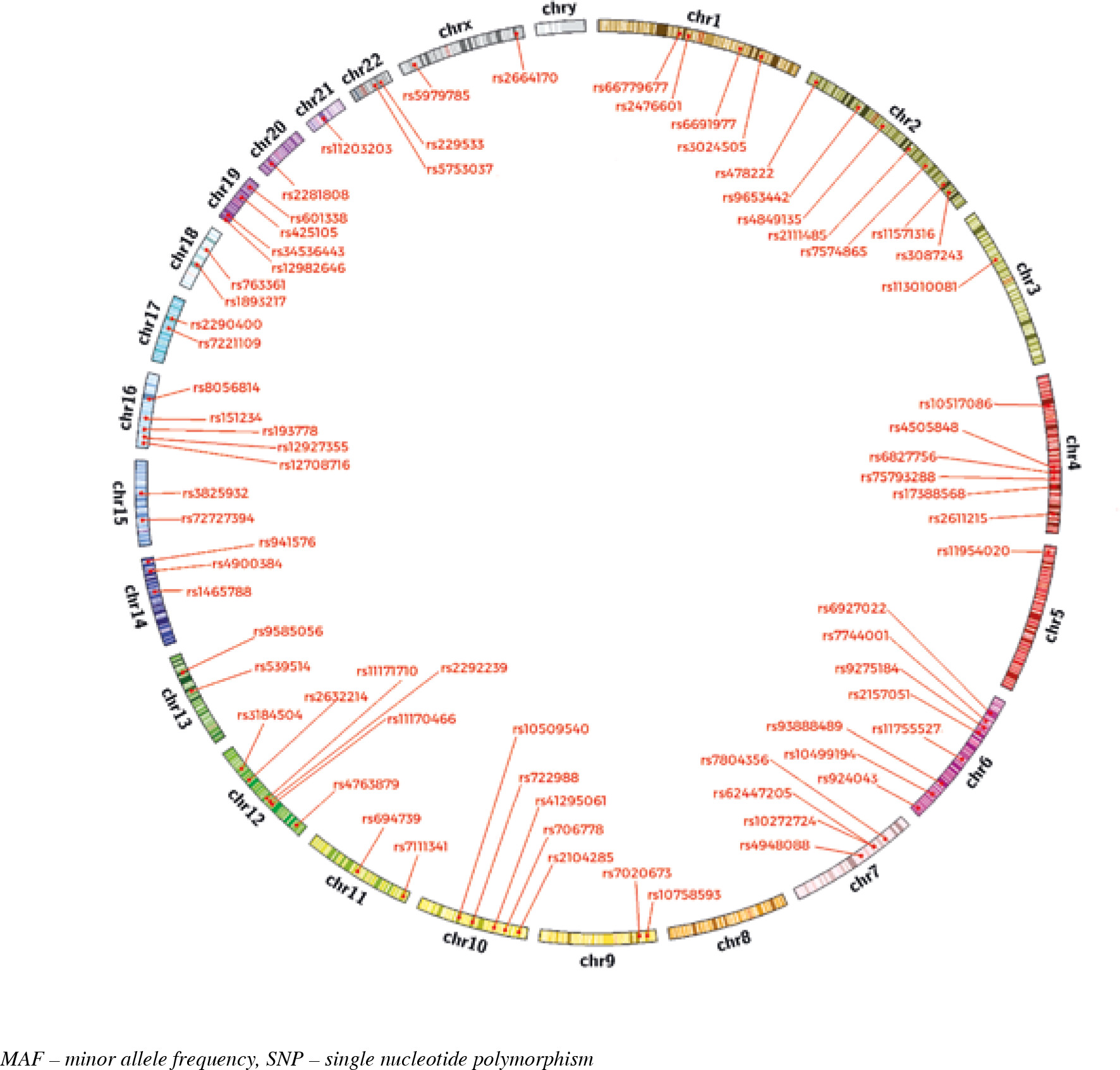 Susceptibility to T1D is strongly associated with a genetic background. GWAS contributed to the discovery of a number of T1D susceptibility genes. Before GWAS only five loci were determined as associated with T1D. They were (in that order): HLA region, INS, CTLA4, PTPN22 and IL2RA. GWAS meta-analyses have identified more than 50 T1D susceptibility loci (Fig. 1). Some of these genes can act as modulators of an immune-related process through both antigen presentation and other modifications of the immune function. A number of candidate genes involved in T1D are known as modulators of β-cell apoptosis, viral infection or islet inflammation. Some of the main factors causing changes in susceptibility to T1D are SNPs and variations in gene expression (genetic variants in regulatory elements of genes can result in alteration of transcription and then gene expression). In addition, most of the identified genes are expressed both in immune competent cells and in pancreatic β-cells, which suggests a genetically modulated dialogue between these two components of T1D. Below we present recently examined genes associated with T1D development according to GWAS study with the statistical threshold for genome-wide significance, P-values < 5 × 10–8 (P-values calculated using Fisher’s combined p-value method implemented in Haploview) [25]. In Table 1 we characterised genes which have been indicated as ones associated with T1D in studies performed so far. Their SNPs positions on chromosomes are illustrated in Figure 1.
