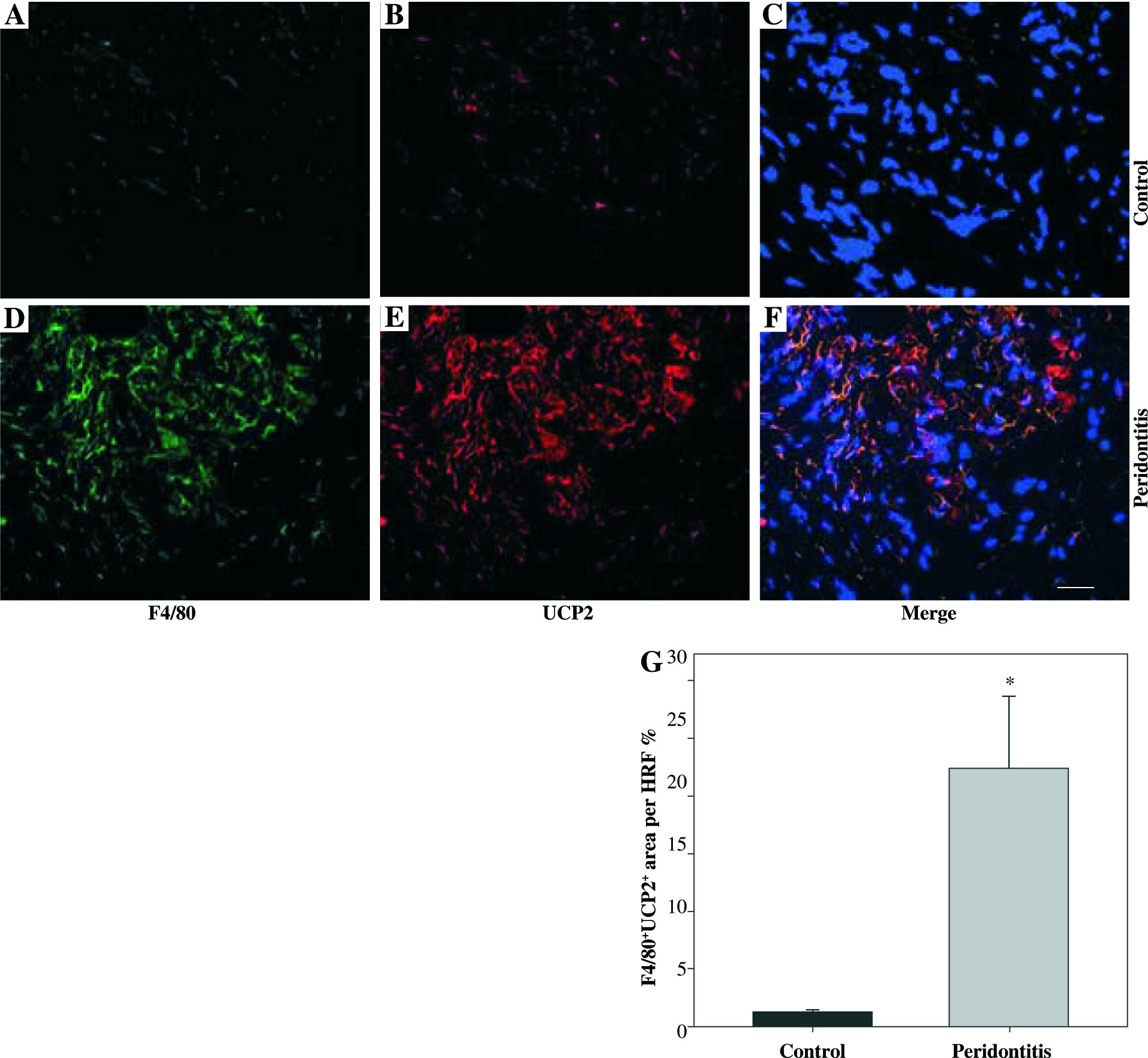 UCP2 is upregulated in the macrophages in human periodontal tissues with periodontitis. (A-F) Representative micrographs showing immunofluorescent staining for F4/80 and UCP2 in human periodontal tissues: (A-C) normal control gingiva, (D-F) gingival tissue with periodontitis. (A, D) Immunofluorescent staining for F4/80, (B, E) immunofluorescent staining for UCP2 (scale bars 100 μm). (G) The F4/80+UCP2+ area in the high power field (HPF) (n = 10, * p < 0.05)