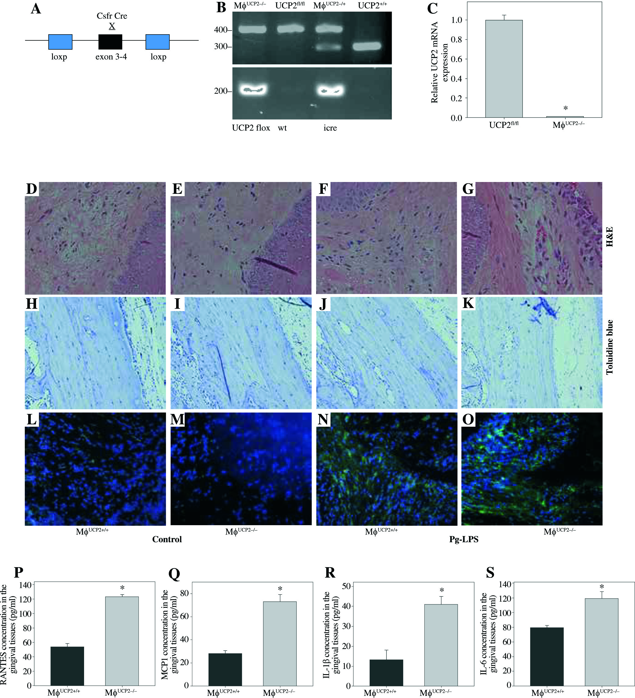 Ablation of UCP2 in macrophages exacerbates mice periodontitis induced by Pg-LPS. (A) Breeding strategy for generating macrophage-specific UCP2 knockout mice (MφUCP2–/–mice). (B) Genotyping of the mice by PCR analysis of genomic DNA. (C) Real-time PCR analysis of UCP2 expression in peritoneal macrophage in MφUCP2–/– mice and control littermates. (D-K) Representative images for H&E and toluidine blue staining in mouse periodontal tissues. (L-O) Representative micrographs showing immunofluorescent staining for F4/80 in mice periodontal tissues. (P-S) The concentration of RANTES, MCP-1, IL-1β, and IL-6 in gingiva was measured using Milliplex Map assays (n = 5, * p < 0.05)