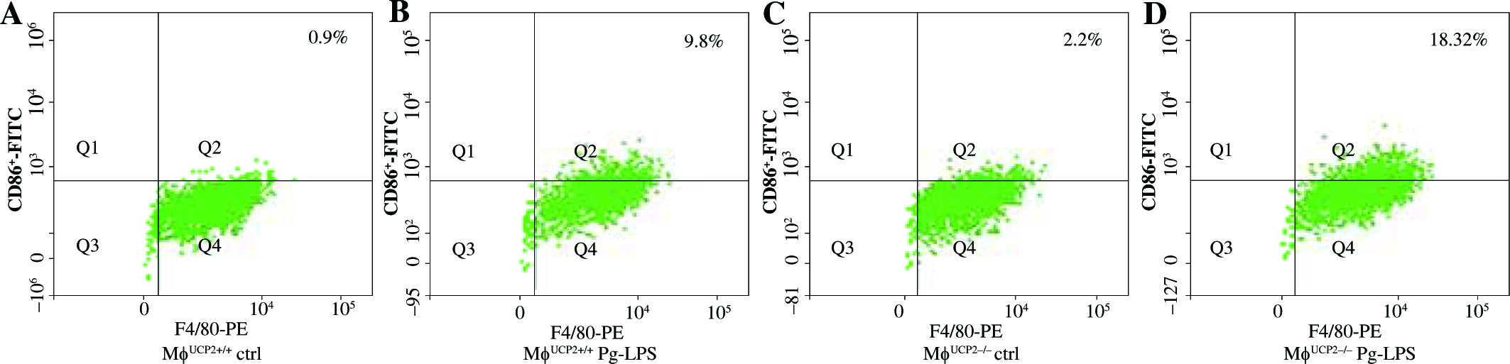 Ablation of UCP2 in macrophages amplifies Pg-LPS-induced M1 macrophage polarization. FACS analysis showing M1 macrophage polarization (F4/80+ CD86+). (A) UCP2+/+ control, (B) UCP2+/+ Pg-LPS, (C) UCP2–/– control, and (D) UCP2–/– Pg-LPS