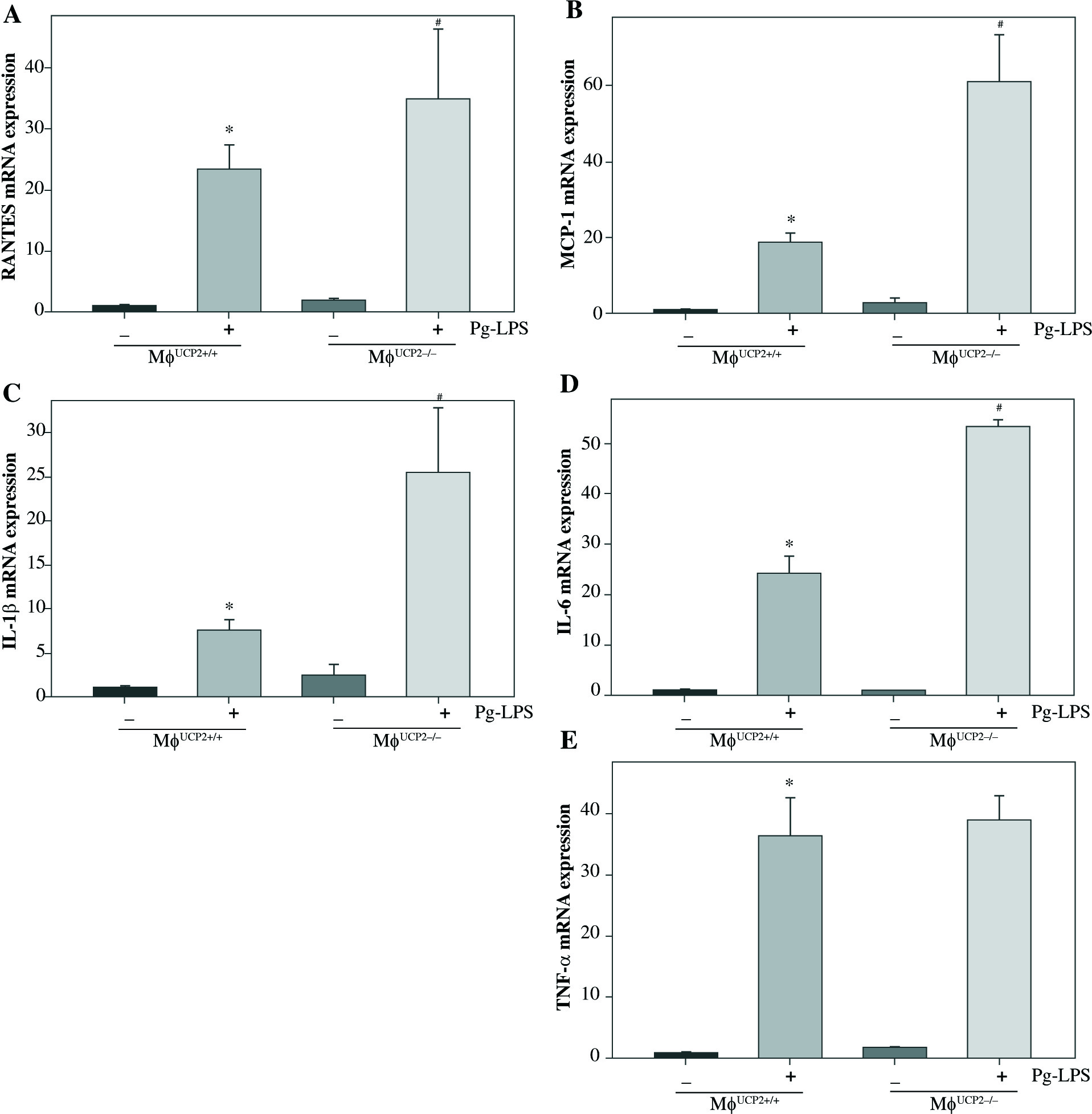 Deletion of UCP2 expression in BMMs aggravates macrophage M1 polarization induced by Pg-LPS. BMMs isolated from MφUCP2–/– mice and control littermates were treated with Pg-LPS for 24 hours. Real-time PCR analysis showing the mRNA levels of (A) RANTES, (B) MCP-1, (C) IL-1β, (D) IL-6, and (E) TNF-α, * p < 0.05 vs. control, # p < 0.05 vs. UCP2+/+ macrophages after Pg-LPS treatment (n = 3)