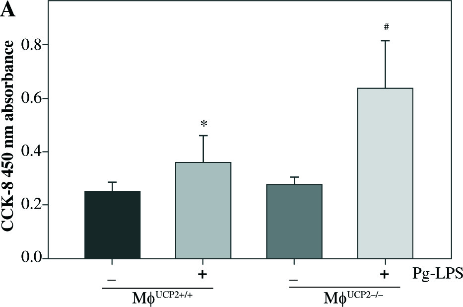 In this study, we found that the expression of UCP2 was upregulated in the infiltrating macrophages in gingival tissues with periodontitis. In addition, macrophage-specific knockout of UCP2 could exacerbate inflammatory responses in gingiva infected with Pg-LPS. The loss of UCP2 enhanced the abilities of proliferation, migration, and pro-inflammatory cytokine excretion in macrophages.