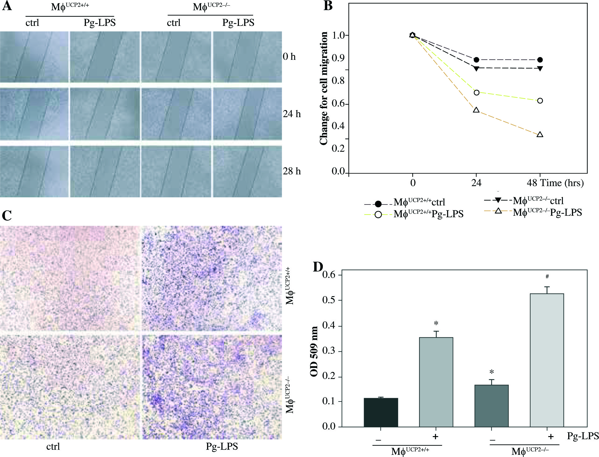 UCP2 mediates macrophage migration. Primary macrophages from bone marrow were treated with Pg-LPS for various times as indicated. (A) Representative images for wound healing test. (B) Quantitative analysis of macrophage motility from wound healing test. (C) Representative images of the Boyden chamber migration assay in BMMs. (D) Graph showing the relative abundance of crystal violet stained in the Boyden chamber. * p < 0.05 vs. control, # p < 0.05 vs. UCP2+/+ macrophages under Pg-LPS stimulation (n = 3)
