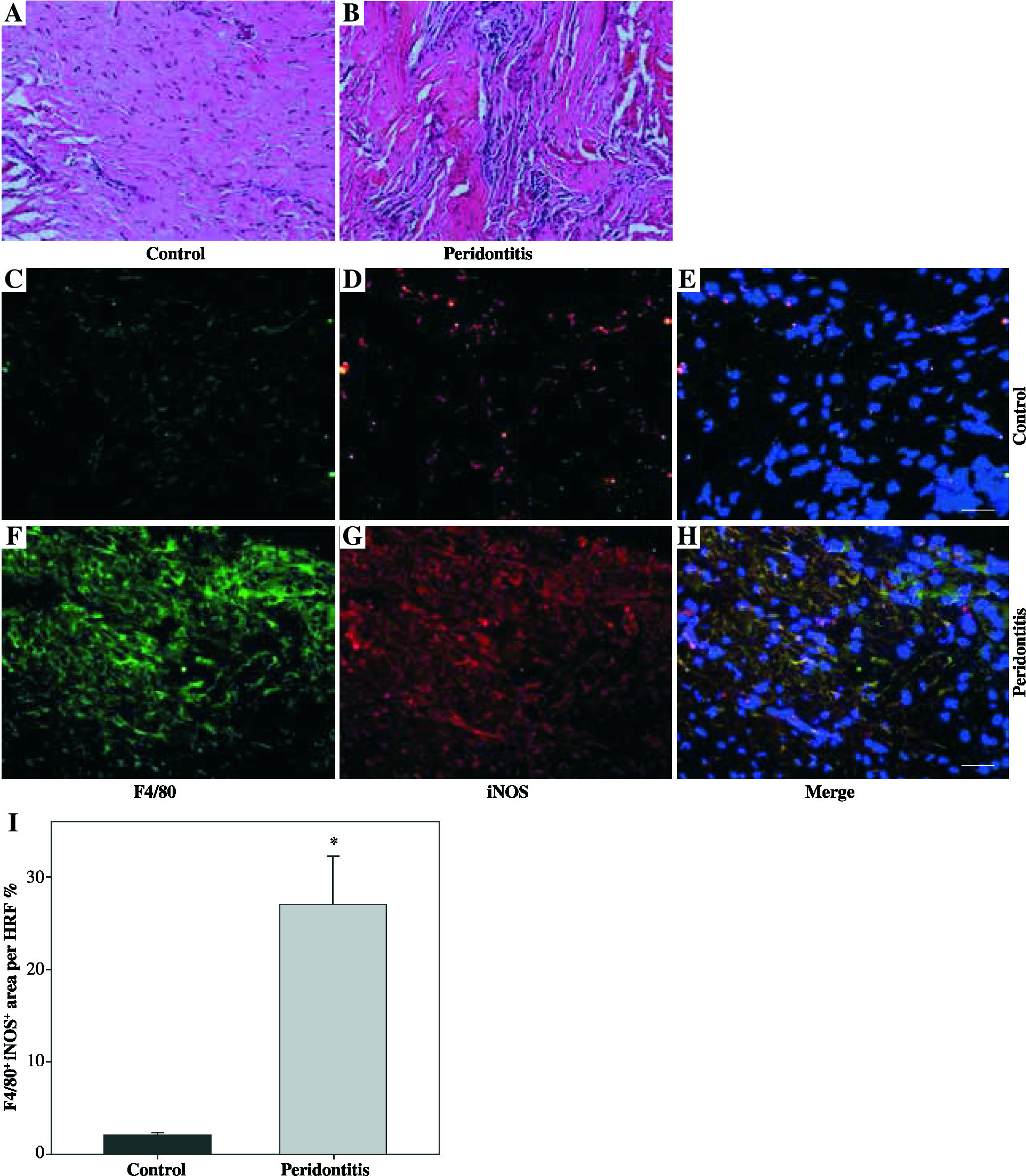 Increased M1 macrophages infiltrating human gingival tissues with periodontitis. (A, B) H&E staining of human gingival tissue: (A) normal control gingiva, (B) gingival tissue with periodontitis. (C-H) Representative images showing the induction of pro-inflammatory macrophages in gingiva with periodontitis: (C-E) normal control gingiva, and (F-H) gingival tissue with periodontitis. (C, F) Immunofluorescent staining for F4/80, (D, G) immunofluorescent staining for iNOS, (E, H) cell nucleus (scale bars 100 μm). (I) The F4/80+ iNOS+ area in the high power field (HPF) (n = 10, * p < 0.05)
