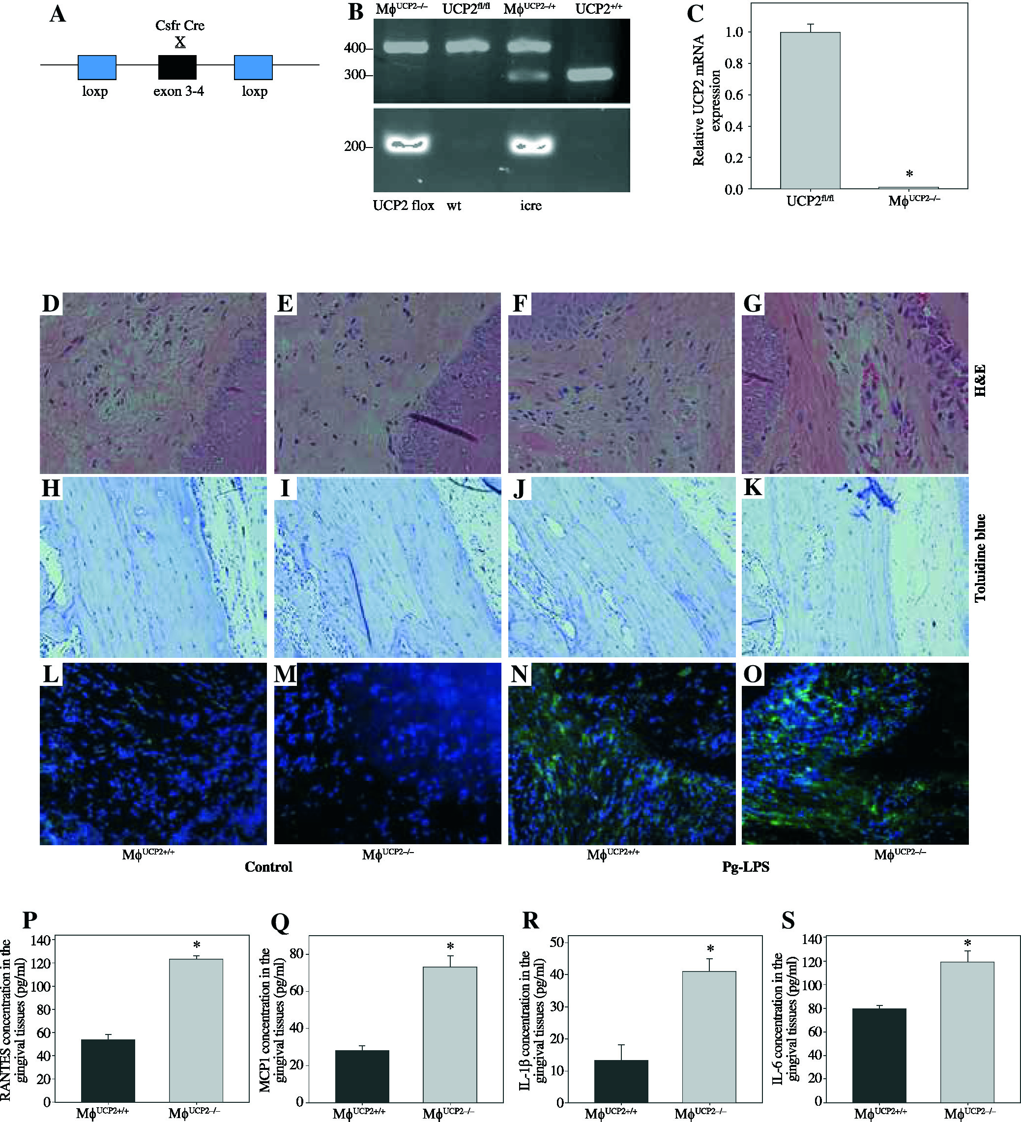 Ablation of UCP2 in macrophages exacerbates mice periodontitis induced by Pg-LPS. (A) Breeding strategy for generating macrophage-specific UCP2 knockout mice (MφUCP2–/–mice). (B) Genotyping of the mice by PCR analysis of genomic DNA. (C) Real-time PCR analysis of UCP2 expression in peritoneal macrophage in MφUCP2–/– mice and control littermates. (D-K) Representative images for H&E and toluidine blue staining in mouse periodontal tissues. (L-O) Representative micrographs showing immunofluorescent staining for F4/80 in mice periodontal tissues. (P-S) The concentration of RANTES, MCP-1, IL-1β, and IL-6 in gingiva was measured using Milliplex Map assays (n = 5, * p < 0.05)
