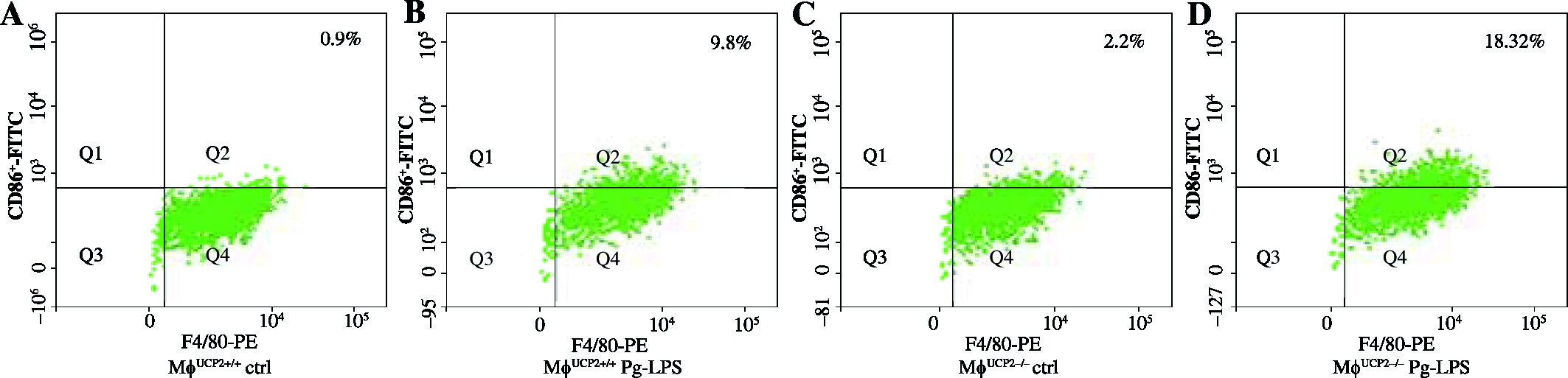 Ablation of UCP2 in macrophages amplifies Pg-LPS-induced M1 macrophage polarization. FACS analysis showing M1 macrophage polarization (F4/80+ CD86+). (A) UCP2+/+ control, (B) UCP2+/+ Pg-LPS, (C) UCP2–/– control, and (D) UCP2–/– Pg-LPS