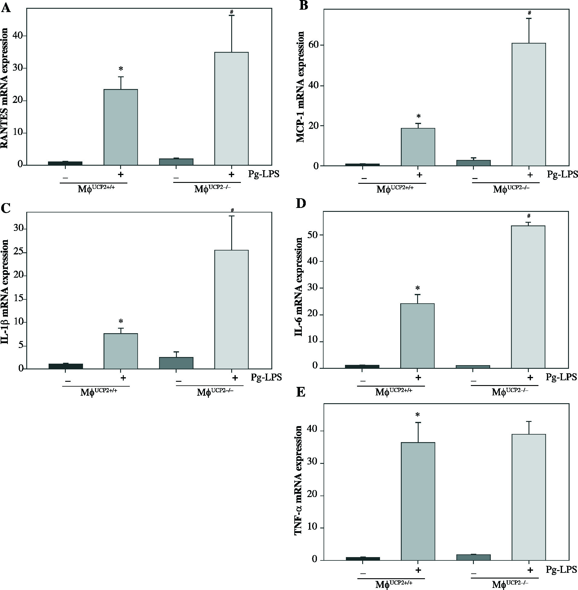 Deletion of UCP2 expression in BMMs aggravates macrophage M1 polarization induced by Pg-LPS. BMMs isolated from MφUCP2–/– mice and control littermates were treated with Pg-LPS for 24 hours. Real-time PCR analysis showing the mRNA levels of (A) RANTES, (B) MCP-1, (C) IL-1β, (D) IL-6, and (E) TNF-α, * p < 0.05 vs. control, # p < 0.05 vs. UCP2+/+ macrophages after Pg-LPS treatment (n = 3)