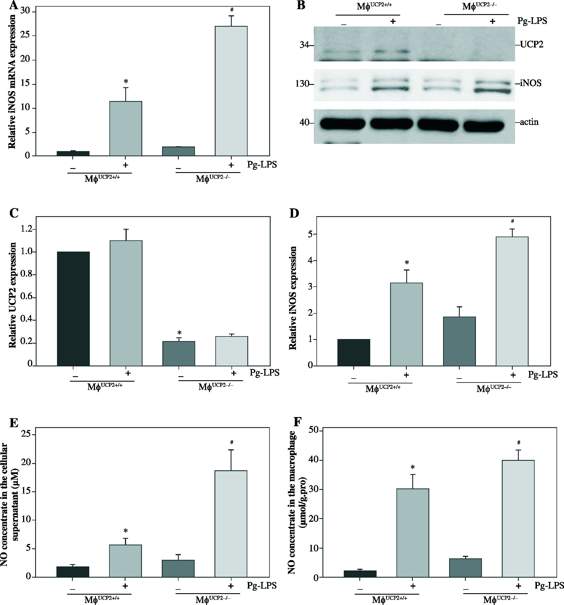 iNOS expression is elevated in UCP2 knockout BMMs upon stimulation with Pg-LPS. BMMs isolated from MφUCP2–/– mice and control littermates were treated with Pg-LPS for 24 hours. (A) Real-time PCR analysis showing mRNA levels of iNOS, * p < 0.05 vs. control, # p < 0.05 vs. UCP2+/+ macrophages after Pg-LPS treatment (n = 3). (B) Protein levels of UCP2 and iNOS expression detected by Western blotting. (C) Semi-quantitative analysis of UCP2 expression, * p < 0.05 vs. UCP2+/+ macrophages (n = 3). (D) Semi-quantitative analysis of iNOS expression, * p < 0.05 vs. control, # p < 0.05 vs. UCP2+/+ macrophages under Pg-LPS stimulation (n = 3). The NO levels in the (E) cell supernatant and (F) macrophages: * p < 0.05 vs. control, # p < 0.05 vs. UCP2+/+ macrophages under Pg-LPS stimulation (n = 5)