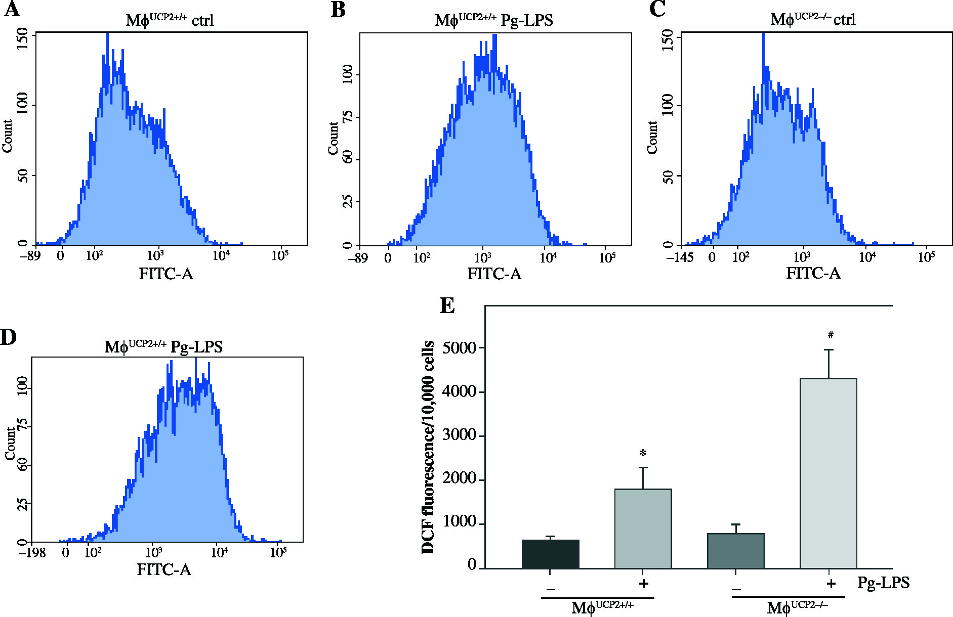 Effects of UCP2 knockout on intracellular ROS production in BMMs stimulated by Pg-LPS. BMMs isolated from MφUCP2–/– mice and control littermates were treated with Pg-LPS for 24 hours. The level of intracellular ROS was measured with DCFH-DA staining. The DCFH-DA fluorescence abundance was detected by flow cytometry, * p < 0.05 vs. control, # p < 0.05 vs. UCP2+/+ macrophages after Pg-LPS treatment (n = 4)