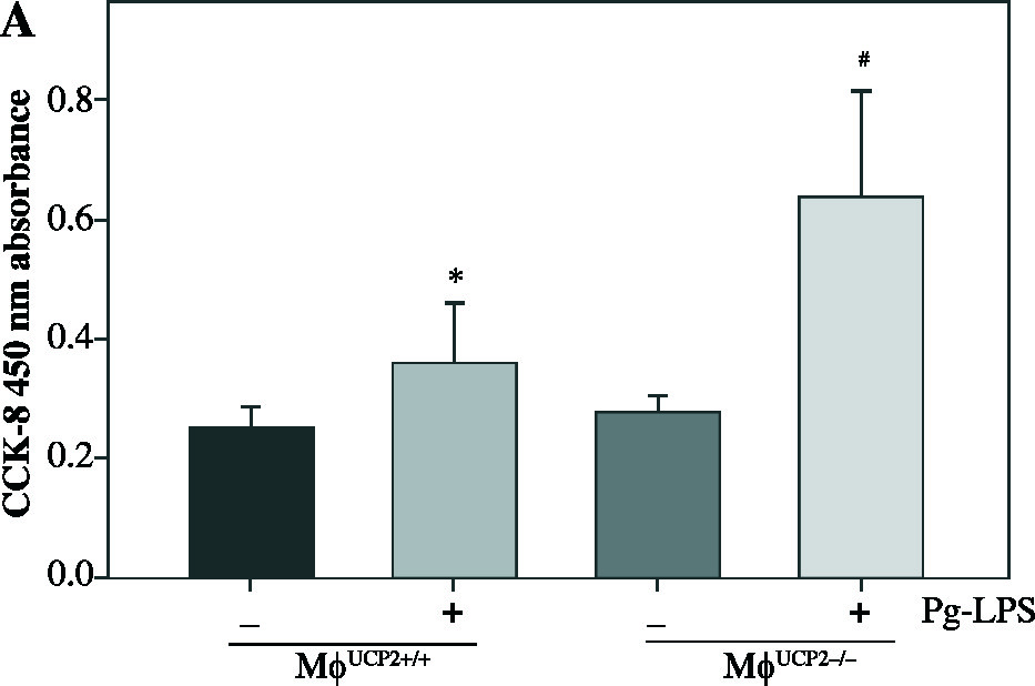 In this study, we found that the expression of UCP2 was upregulated in the infiltrating macrophages in gingival tissues with periodontitis. In addition, macrophage-specific knockout of UCP2 could exacerbate inflammatory responses in gingiva infected with Pg-LPS. The loss of UCP2 enhanced the abilities of proliferation, migration, and pro-inflammatory cytokine excretion in macrophages.