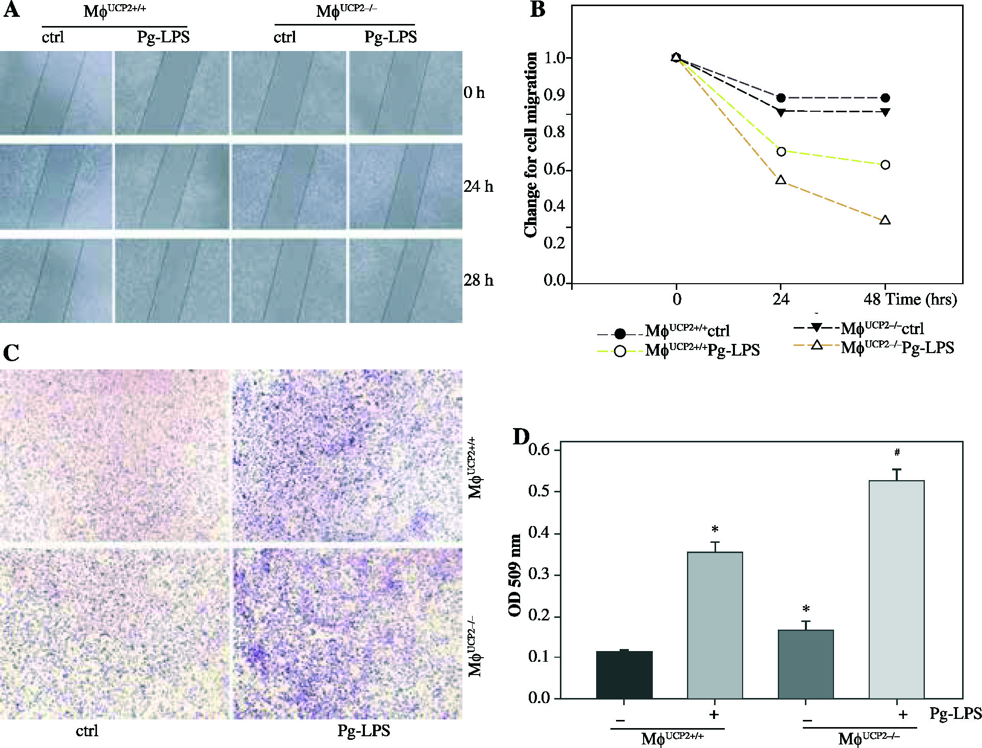 UCP2 mediates macrophage migration. Primary macrophages from bone marrow were treated with Pg-LPS for various times as indicated. (A) Representative images for wound healing test. (B) Quantitative analysis of macrophage motility from wound healing test. (C) Representative images of the Boyden chamber migration assay in BMMs. (D) Graph showing the relative abundance of crystal violet stained in the Boyden chamber. * p < 0.05 vs. control, # p < 0.05 vs. UCP2+/+ macrophages under Pg-LPS stimulation (n = 3)