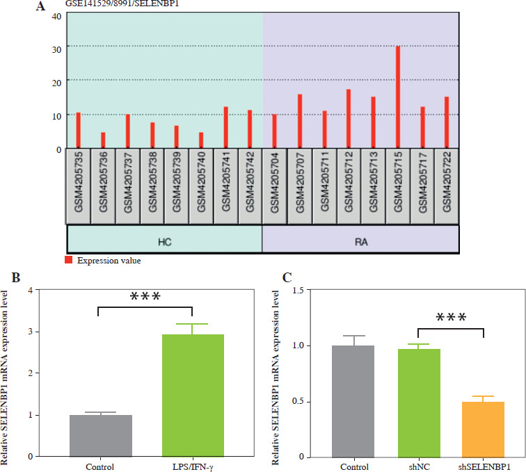 SELENBP1 is highly expressed in rheumatoid arthritis and LPS/IFN-γ-induced macrophages. A) Gene expression profile of selenium-binding protein 1 (SELENBP1) was analyzed by bioinformatics methods in GSE141529. B) Level of SELENBP1 in THP-1 cells stimulated with LPS/IFN-γ was detected by real-time quantitative polymerase chain reaction (RT-qPCR). C) Level of SELENBP1 in THP-1 cells transfected with shSELENBP1 was detected by RT-qPCR. Each experiment was repeated three times. ***p < 0.001