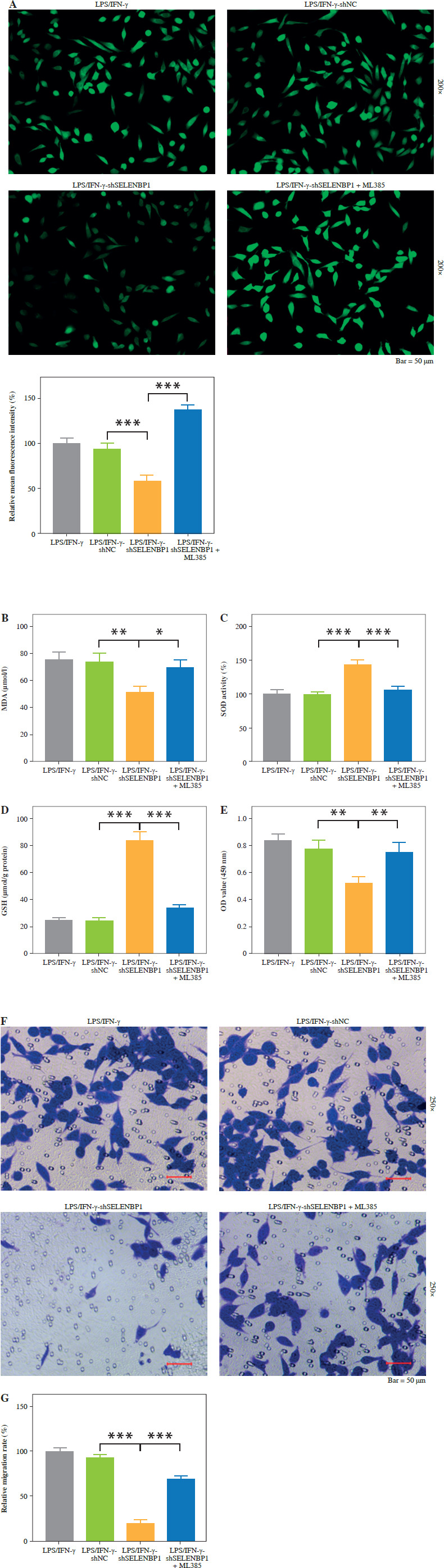 Transient transfection of short hairpin RNA (shRNA) oligonucleotides targeting SELENBP1 (shSELENBP1, 5´-CACTTATATGTATGGGACT-3´; GeneCopoeia, Guangzhou, China) and a negative control (shNC, 5´-TTCTCCGAACGTGTCACGT-3´; GeneCopoeia, Guangzhou, China) was performed using Lipofectamine 2000 reagent (11668019, Invitrogen, CA, USA). THP-1 cells were cultured to 30-40% confluency and divided into control, LPS/IFN-γ, LPS/IFN-γ-shNC, LPS/IFN-γ- shSELENBP1 and LPS/IFN-γ-shSELENBP1+ML385 groups. LPS/IFN-γ-shNC, LPS/IFN-γ-shSELENBP1 and LPS/IFN-γ-shSELENBP1+ML385 groups were transfected with corresponding shRNA oligonucleotides (20 pmol). The cultures were grown for 48 hours after transfection. THP-1 cells in the LPS/IFN-γ-shSELENBP1 + ML385 group were treated with a specific inhibitor of NRF2 (ML385; 5 µM, treated for 0.5 hours) (846557-71-9, MCE, NJ, US) [17]. Then, LPS/IFN-γ, LPS/IFN-γ-shNC, LPS/IFN-γ-shSELENBP1 and LPS/IFN-γ-shSELENBP1 + ML385 groups were treated with LPS/IFN-γ as described above for subsequent investigations.