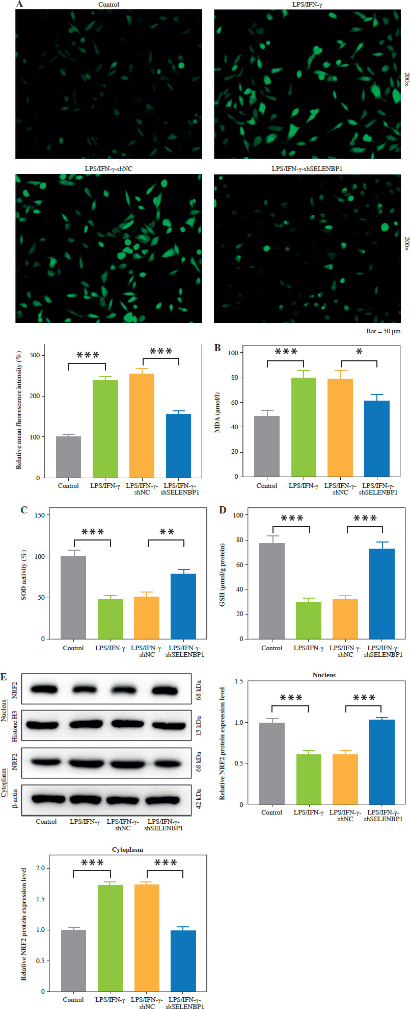 Analysis of ROS production, oxidative stress and NRF2 expression in THP-1 cells. A) ROS levels in THP-1 cells of control, LPS/IFN-γ, LPS/IFN-γ-shNC, and LPS/IFN-γ-shSELENBP1 groups were detected by 2′,7′-dichlorodihydrofluorescein diacetate (DCFH-DA) assay. Magnification 200×, scale bar 50 μm. B) Levels of malondialdehyde (MDA) in THP-1 cells of control, LPS/IFN-γ, LPS/IFN-γ-shNC, and LPS/IFN-γ-shSELENBP1 groups were detected by assay kits C, D) Levels of superoxide dismutase (SOD), and glutathione (GSH) in THP-1 cells of control, LPS/IFN-γ, LPS/IFN-γ-shNC, and LPS/IFN-γ- shSELENBP1 groups were detected by assay kits. E) NRF2 protein levels in nuclear and cytoplasmic fractions of THP-1 cells in control, LPS/IFN-γ, LPS/IFN-γ- shNC, and LPS/IFN-γ-shSELENBP1 groups were detected by Western blot. Histone H3 was used as a nuclear loading control, and β-actin as a cytoplasmic loading control. Each experiment was repeated three times. *p < 0.05, **p < 0.01, ***p < 0.001
