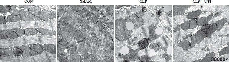 Transmission electron microscopy analysis was conducted to visualize the morphology of mitochondria. As shown in Figure 2, the cecal ligation and puncture operation induced mitochondrial swelling, ruptured cristae, and lipid droplet formation. However, administration of UTI resulted in improved mitochondrial injury compared to the CLP group.