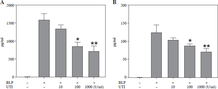 THP-1 cells (2 × 105 cells/well) were cultured in 24-well plates. Cells in the control group were exposed to an incomplete RPMI 1640 medium. In contrast, the treated cells were subjected to 1,000 ng/ml of BLP for 4 hours. THP-1 cells were stimulated with UTI at varying concentrations (10, 100, and 1000 U/ml) alongside 1,000 ng/ml BLP, and the incubation procedure was carried out for the same duration. Following the incubation, the cell supernatant underwent collection and was promptly subjected to centrifugation at 3,000 rpm for 10 minutes at 4oC.