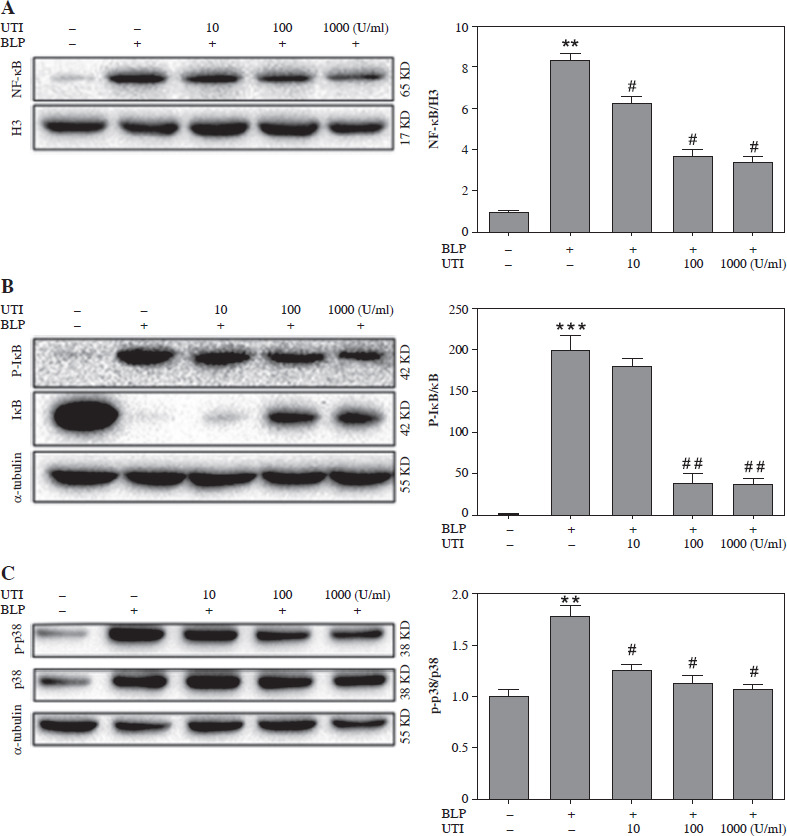 Subsequently, BLP stimulation of THP-1 cells caused an increase in P38 phosphorylation, and UTI reduced P38 phosphorylation in a concentration-dependent manner (Fig. 5C).