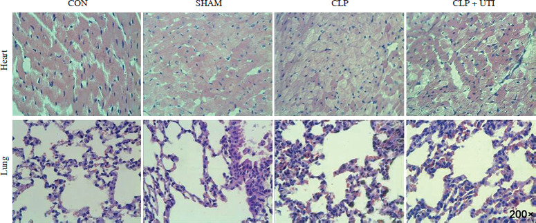 Hematoxylin & eosin (HE) staining was used to determine the pathological changes in the myocardial tissue and the lung tissue in the control, sham operation, CLP, and CLP + UTI groups. HE staining showed normal cardiomyocyte morphology and regular arrangement of myocardial fibers in the control group and apparent myocardial injury in the CLP-induced sepsis group (magnification 200×). CON – control group, SHAM – sham operation group, CLP – cecal ligation and puncture group, CLP + UTI – cecal ligation and puncture + urinary trypsin inhibitor UTI (5000 U/kg) administration group