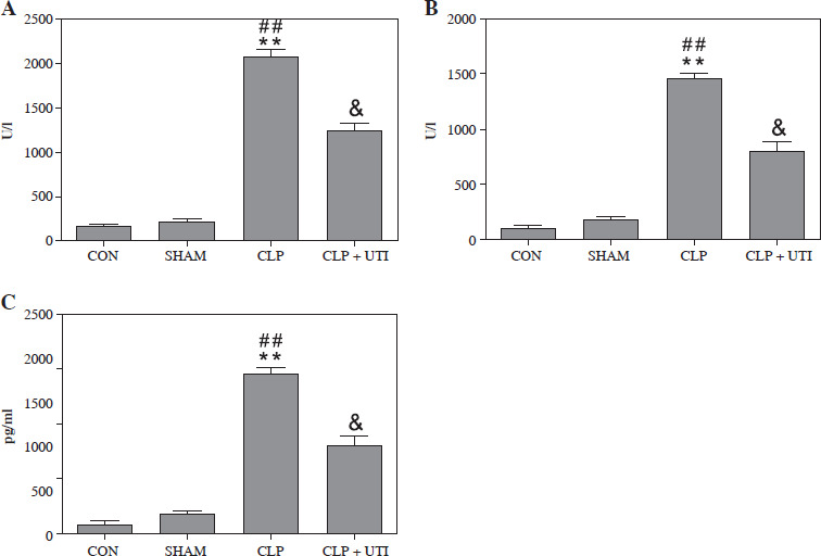 Changes of myocardial enzyme indexes and serum IL-1β in mice from each group. A) Muscle kinase isoenzyme (CK-MB); B) Aspartate aminotransferase (AST); C) Interleukin 1β. Plasma levels of CK-MB, AST, and IL-1β in the cecal ligation and puncture (CLP) group were markedly higher than those in the control group and the sham operation group. Urinary trypsin inhibitor (UTI) treatment significantly reduced CK-MB, AST, and IL-1β levels from the CLP + UTI group compared with the CLP group (n = 10). Values are expressed as mean ± standard error of the mean. **p < 0.01 vs. control group, ##p < 0.01 vs. SHAM group, &p < 0.05 vs. CLP group. CON – control group, SHAM – sham operation group, CLP – cecal ligation and puncture group, CLP + UTI – cecal ligation and puncture + urinary trypsin inhibitor (5000 U/kg) administration group