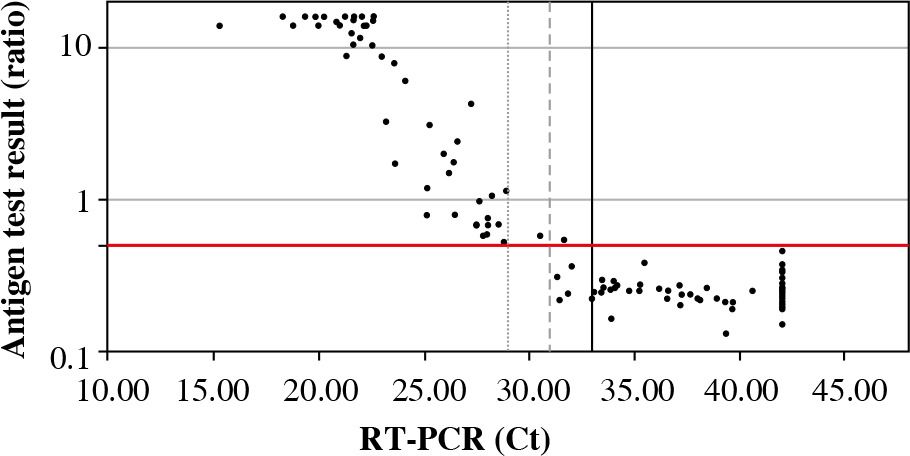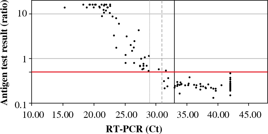 Based on the results of the comparative study, the sensitivity and specificity of the antigen test were determined depending on the cut-off point of the Ct value in the reference test (RT-PCR) (Table 2, Fig. 2).