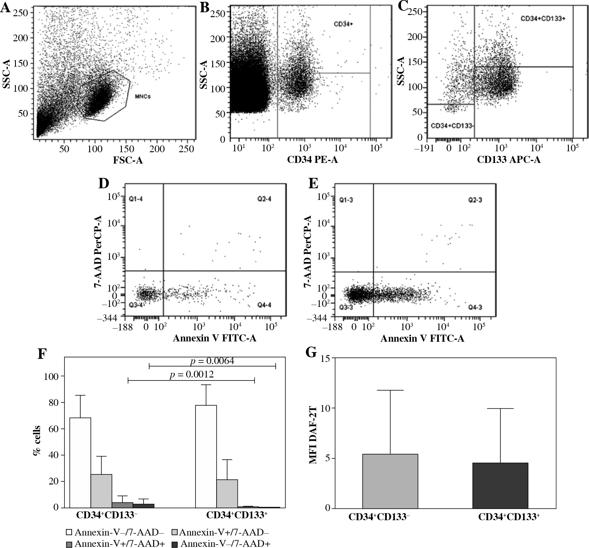 Cytometric identification, viability, and intracellular nitric oxide (NO) generation in umbilical cord blood (UCB) CD34+CD133– and CD34+CD133+ cell populations (n = 19). A) Representative dot plot of UCB mononuclear cells (MNCs) identified by forward and side scatter characteristics (FSC and SSC, respectively). 2 × 106 MNC samples were evaluated. B) Progenitor cells were separated from MNCs using CD34 gate. C) CD133+ and CD133– subsets were identified. Viable (Annexin V−/7-AAD−), early apoptotic (Annexin V+/7-AAD−), late apoptotic (Annexin V+/7-AAD+) and necrotic (Annexin V−/7-AAD+) cells were distinguished in (D) CD34+CD133– and (E) CD34+CD133+ cell populations. F) Percentages of viable (white bars), early apoptotic (light grey bars), late apoptotic (dark grey bars) and necrotic (black bars) CD34+CD133– and CD34+CD133+ cells. More details of multifactorial ANOVA analysis have been summarized in Table 2. G) Intracellular NO production in CD34+CD133– and CD34+CD133+ cells was assessed by flow cytometry and is expressed as mean fluorescence intensity (MFI) of triazolofluorescein (DAF-2T). F, G) Data are the mean ±SD