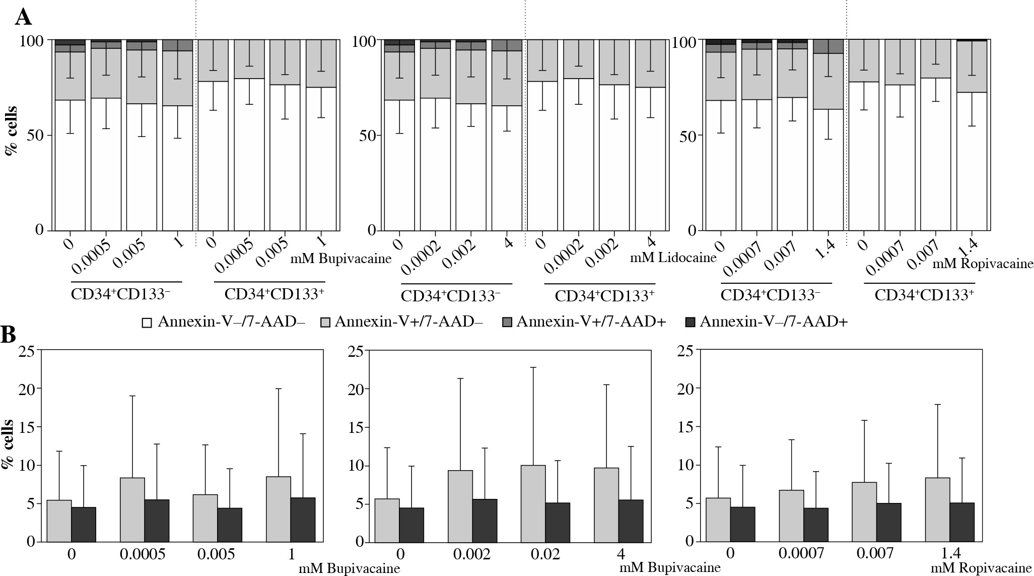 Percentage of viable (Annexin V+/7-AAD-), early apoptotic (Annexin V+/7-AAD-), late apoptotic (Annexin V+/7-AAD+), and necrotic (Annexin V+/7-AAD+) UCB CD34+CD133- and CD34+CD133+ cells exposed to bupivacaine, lidocaine and ropivacaine