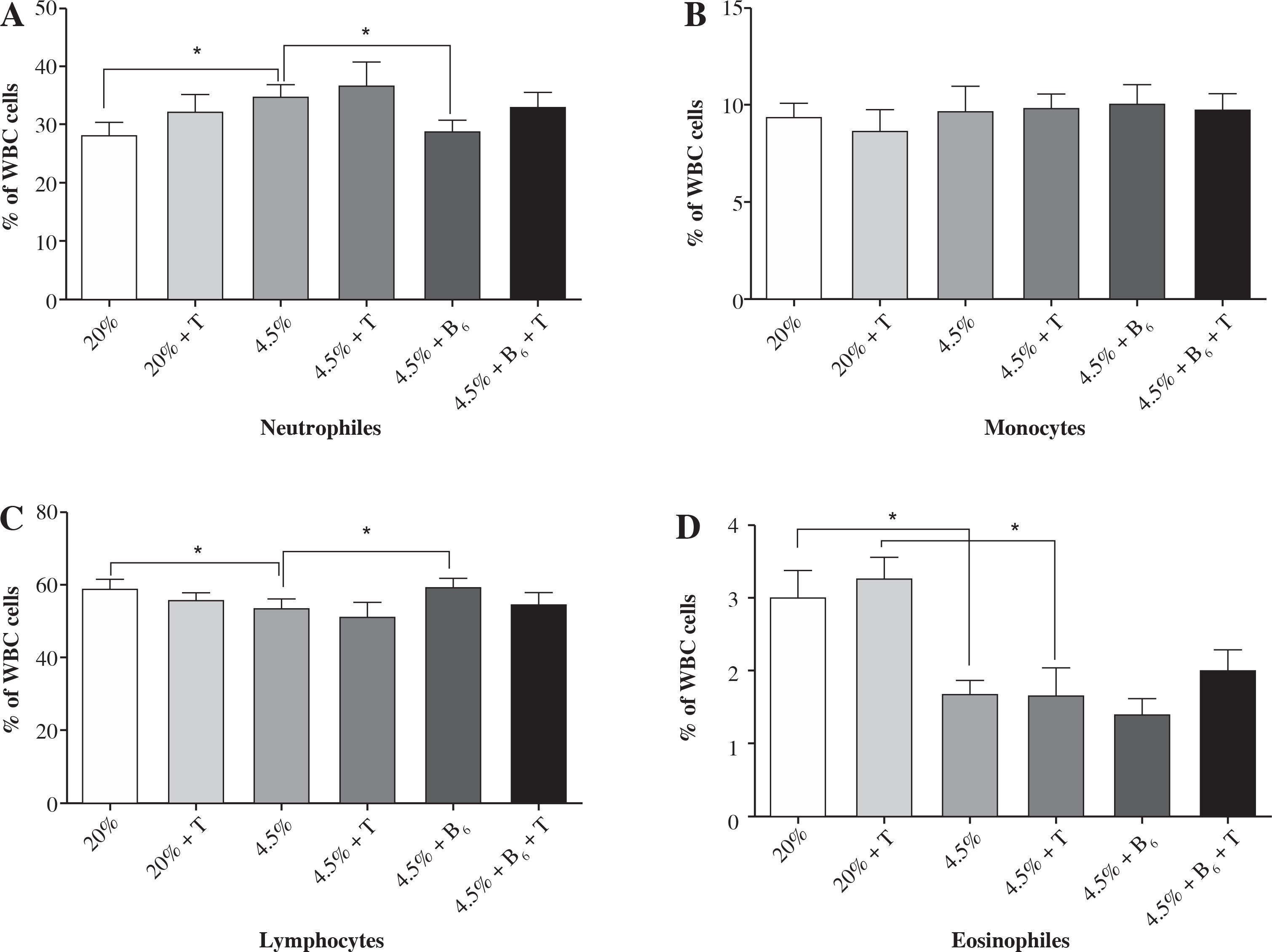 There was no significant difference in the white blood cell subpopulations (neutrophils, eosinophils, monocytes, and lymphocytes) between exercised and unexercised rats in all studied groups (I-VI). The rats fed protein-deficient diets had a higher percentage of neutrophils (about 20%, p < 0.05) and a lower percentage of lymphocytes (about 10%, p < 0.05). Both groups fed the protein-deficient diet (group II-VI) presented the level of eosinophils at half the norm. Supplementing the diet with vitamin B6 reduced the effect of protein malnutrition on the percentage of neutrophils and lymphocytes; it did not, however, affect the level of eosinophils.