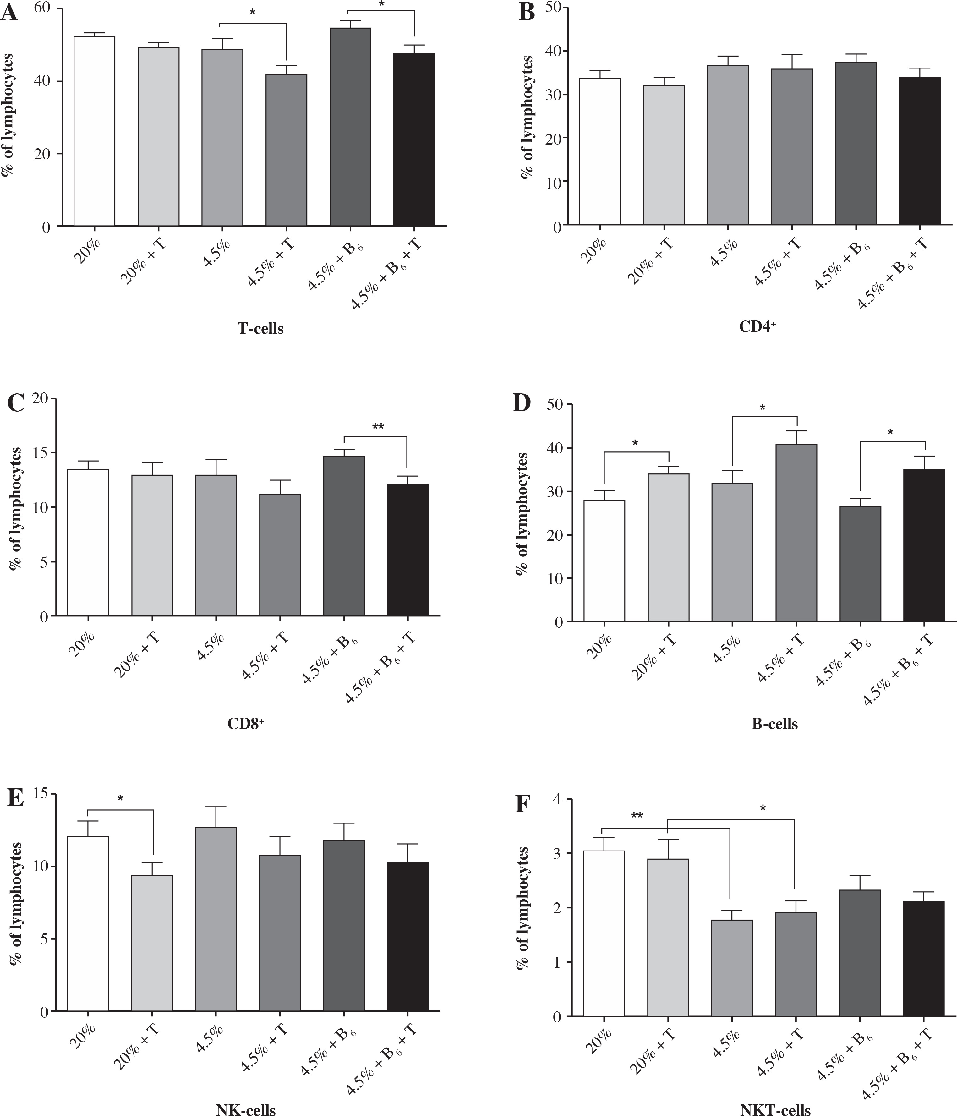 Determination of lymphocyte subpopulations in the blood of rats fed the control diet showed the percentage distribution typical for the rat [21, 22]. A protein-deficient diet caused a significant reduction of NKT cells in all studied groups (II-IV); the reduction was not affected by vitamin B6 supplementation. There were several significant changes observed in the exercised rats (groups II, IV, and VI) in comparison to the control groups. The percentage of T-cells (CD3+) was lower (about 15%, p < 0.05) in the blood of rats fed the protein-deficient diets (both the non-supplemented and supplemented with vitamin B6). These changes were associated with the reduction in the percentage of CD8+ T cells. This reduction (about 20%) was significant (p < 0.01) in exercised rats fed the protein-deficient diet supplemented with vitamin B6. In contrast to the T-cells, the percentage of B-cells was higher in all exercised rat groups (over 20%, p < 0.05), with the highest difference (about 32%, p < 0.05) in the protein-deficient group supplemented with vitamin B6. There was also a significant decrease (about 30%, p < 0.05) in the percentage of NK cells, but only in the rats fed the control diet.