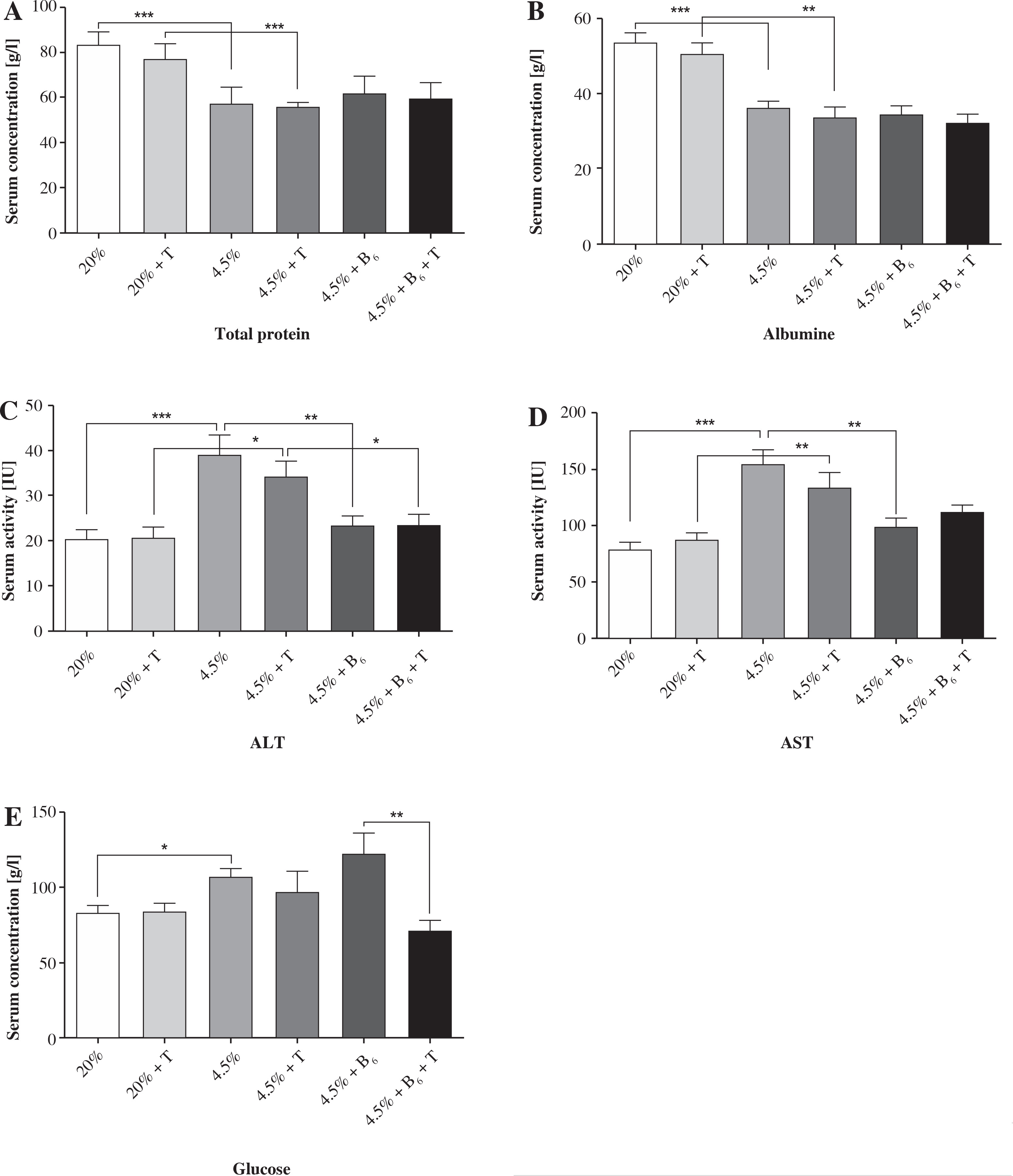 The level of vitamin B is severely reduced in protein malnutrition. The main symptoms of protein deficiency are reduced body and muscle weight and decreased protein concentration in the serum [14]. Prolonged protein malnutrition decreases levels of hormones, cytokines, and growth factors and results in various organ dysfunctions (especially liver and skin), hypoalbuminaemia, vascular damage, and hepatic steatosis [15-17]. It also affects haematological and immunological parameters [18]. Studies on BALB/c mice fed a protein-deficient diet (20 γ of casein/kg diet) showed that the protein malnutrition affects proliferation of splenic cells and maturation and function of T lymphocytes, and causes changes in lymphoid organs significantly affecting the immune and inflammatory responses [19-21].
